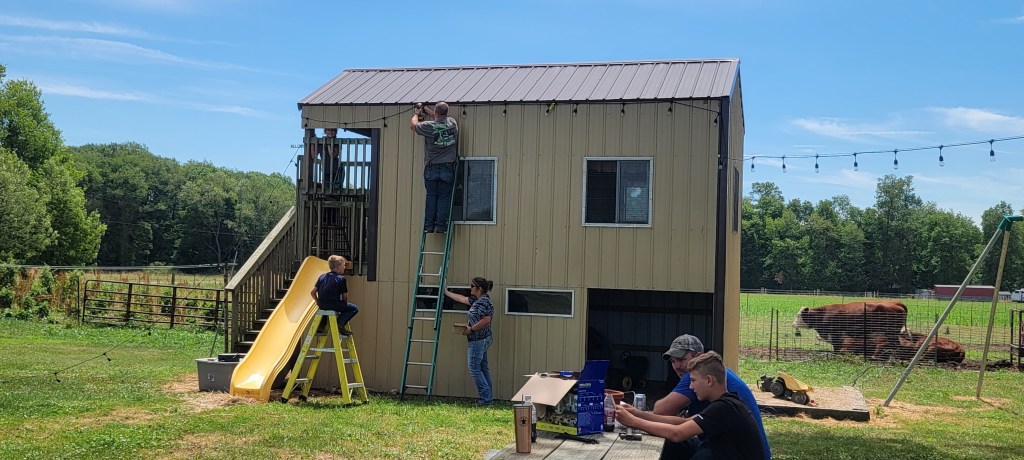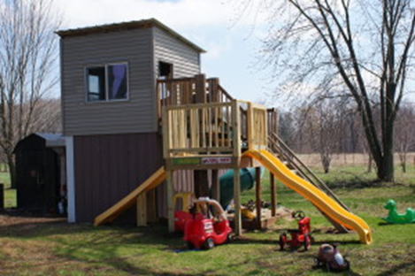 At least one or two days a week, you can drive by our farm and you will see all those yellow and red plastic cars left discarded in the yard, children riding tractors, bikes, tricycles. Or you may see them climbing up to the two-story playhouse that I built for the first of our grandbabies about five years ago. In a group effort, everyone helped me build this playhouse for the grandkids out of a woodshed that was made for our outdoor central boiler, after we relocated the Boiler unit.
