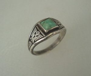 I chose a ring that looked similar to a class ring. I wore that ring and never took it off. At my wedding I wore it, during the birth of our three children I wore it, and I still have it today and though I don’t wear it much , it is one of my most prized possessions. It is from the “Fred Harvey Era Collection” and has thunderbirds imprinted on both sides and a perfectly square turquoise stone on top. It cost the same as my age then…I remember. 13.00 . Today I found it on ebay and it is a collectors piece and values for around 96.00.