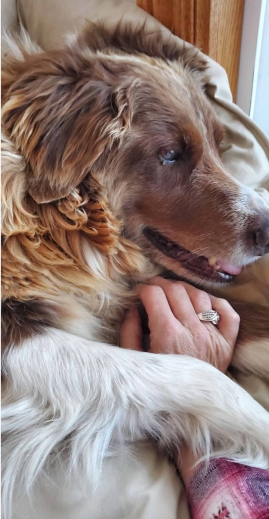 I fell off the top of a ladder (roofline level) onto a wooden boardwalk. I was unconscious. An ambulance was called, and paramedics worked on me. Our oldest daughter said that during that entire time, Brutus wouldn’t leave my side. When their Dad drove in the drive, Brutus got up and ran to him and then raced back to me. He was a devoted pal.