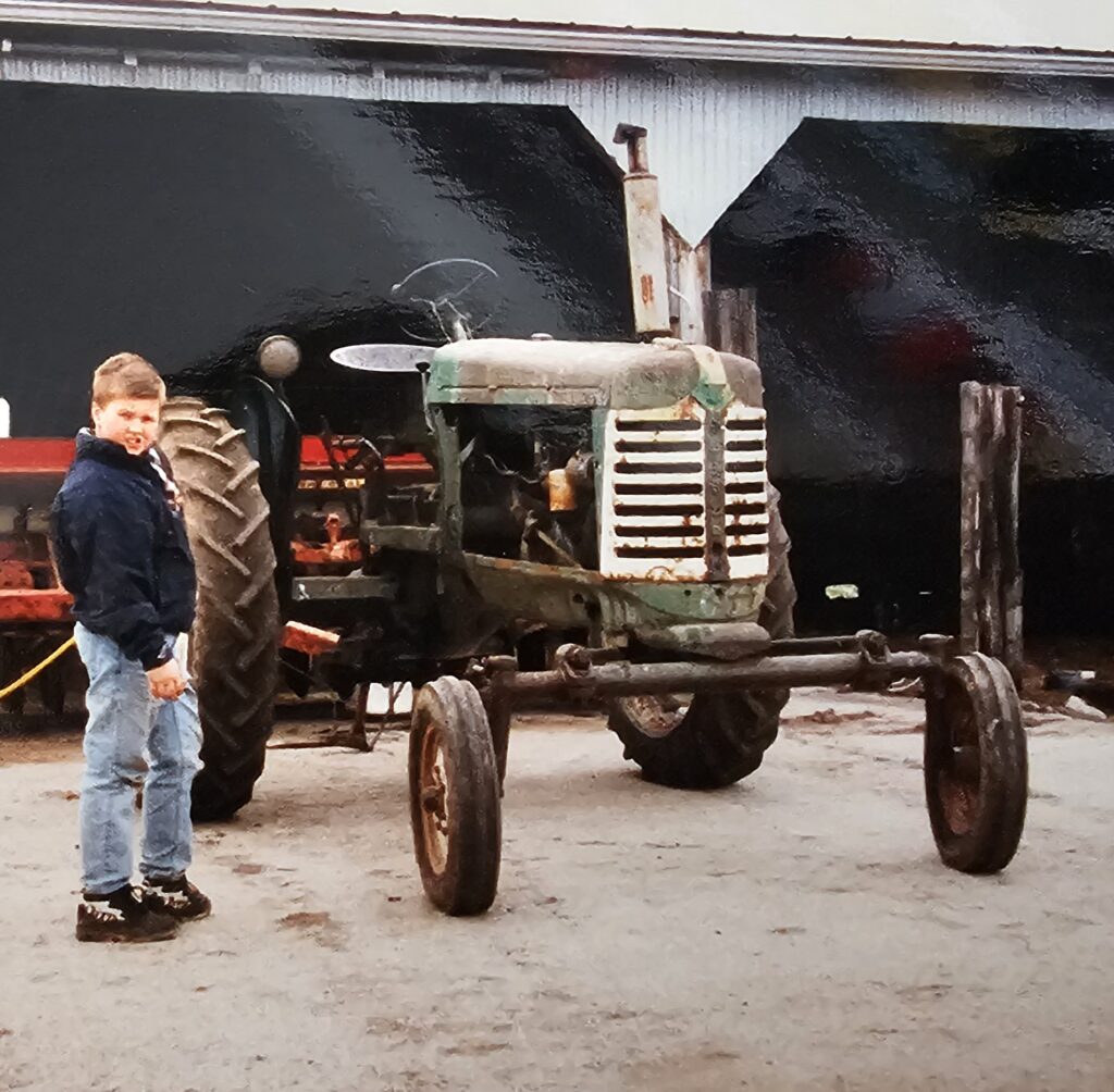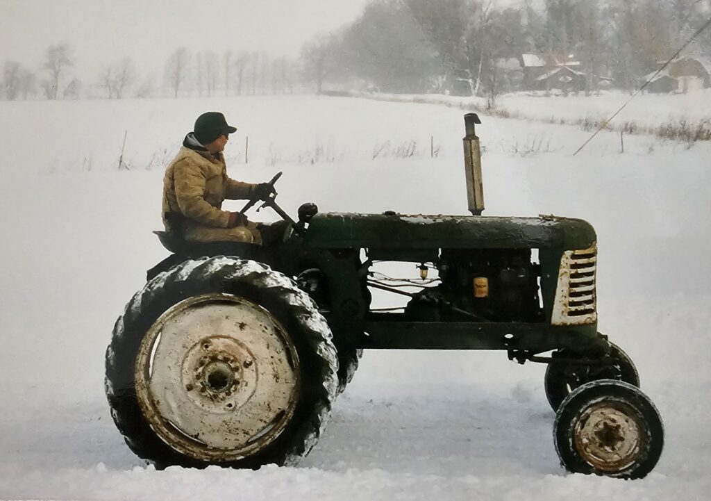 This is the OLIVER ROW CROP 66 wide front-end tractor that Burt bought new in 1949. When I bought the farm, in 1994, it was part of the package deal, along with 60 head of cattle and misc other farm equipment. It was already forty-five years old when I bought it. We used it for a few years, and I can attest that that old tractor always started. Once, during one of the worst blizzards, it was the ONLY tractor on this farm that would start and pull our truck out of the ditch. It was reliable and dependable though she cosmetically didn’t look so good. Her fender skirts were gone, her color had faded. Burt had repainted it once with primer and never got back around to adding the right restoration colors. This tractor was later sold, and it broke my heart to see it go. (That is our son, in the top photo and again in the bottom photo)