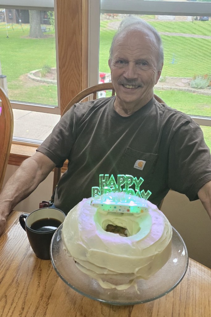 So, the evening before his birthday, I invited him and his wife over for a simple dinner. Which didn’t turn out as I had hoped meal-wise. I am accustomed to cooking for large groups of people most of the time, with our children and grandchildren around us. That being said, I made a meatloaf that turned out to be too large, filling the pan to overflowing, and it took longer to cook than I had anticipated. The potatoes didn’t cook well; they literally boiled down to a soup. The only thing that turned out was the homemade carrot cake. I took a photo of Dad with his cake, and then I pulled a special plate out of my China cabinet. His mom, My grandma Doris had given this little plate to me years ago and said she served his birthday cake on it every year, his and his little brothers. It is very dried and cracked but so precious to see him holding the cake his mom used to put his small birthday cakes on.