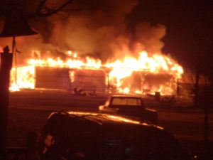 I jumped out of my recliner and raced to the kitchen. There are 3 large windows that face the west, and a bay that is over the sink and faces the west. I looked up at the light over the sink, it wasn’t flickering. .I looked again fearing it had a short in the wiring. Still nothing. Suddenly, The whole kitchen was flickering and it seemed so bright for just one light over the sink on. I looked out the 3 windows by the table and I screamed… over and over I screamed. Our entire barn was a blaze in flames. I have never witnessed such a fire in person. (Photo taken by our daughters,)