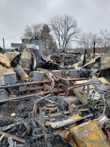 Our son in law, ask if I thought he could save his Bosses truck, that He drives as the main crew leader for the company. The drivers side was all smoking and the flames from the building appeared to be the only dangerous part. So I said, “Maybe if you slide in from the passenger side. The moment He started that truck and drove it out from between the two building the wind hit it and the entire side of the truck was in flames. I was screaming for our son in law that it was on fire…..but as he is always a calm and collected man, he drove it to the water pump, put out the flames and then had the mind set to drive the truck out into the middle of a field just in case it still would blow.