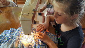 So Allyson sewed an apron, and then Alaina sewed her aprons and last was Emmalynn. The same pattern repeated itself. Each girl did the work, though this was their first time sewing and I thought they did a really good job as sewing and listening to me. Go forward, slow down, follow the line, now push the reverse button but keep your foot going. It was a good time, and we laughed much.