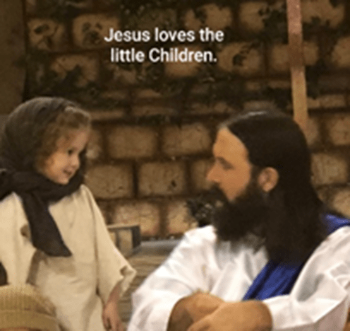 Our youngest grand daughter Norah, is two. She has been so mesmerized by this man portraying Jesus. On one of the first nights, as her Mom was trying to gather up her five children to go home, as it was getting late, Norah stops her mommy and says “Wait Mom, I have to talk to Jesus, and tell him goodbye”. She was so in LOVE with JESUS.. To have the faith and love of a child is precious. No wonder in Mark10:14 Jesus said “Let the little children come to me, and do not hinder them, for the kingdom of God belongs to such as these.”