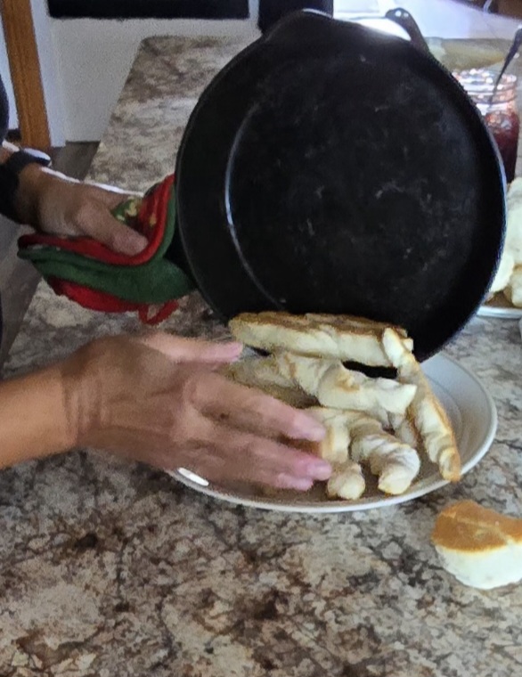 When she and her pop back in the 40’s were migrant fruit harvesters, they moved from one state to another as the crops ripened, and would stay in little white cabins, sometimes a barn, they had to share with other families, with only blankets between them. This one particular cabin was so small, she said, “You had to go outside to change your mind”. The oven in that cabin was so small that her skillet would not fit in the oven, so Pop had taken the skillet outside and broke the handle off about halfway down, leaving barely enough of a stub to hold on to it, but it fit in the tiny oven….biscuits every morning on schedule. All was right with the world.